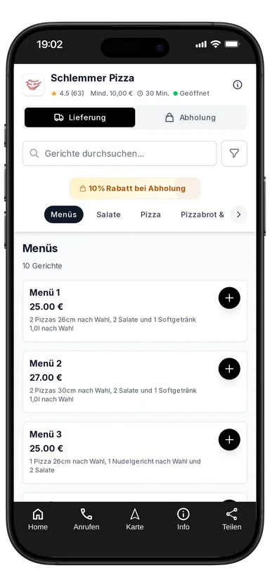 1 Pizza 30cm nach Wahl, 1 Salat und 1 Softgetränk 0,33l nach Wahl